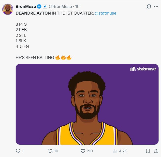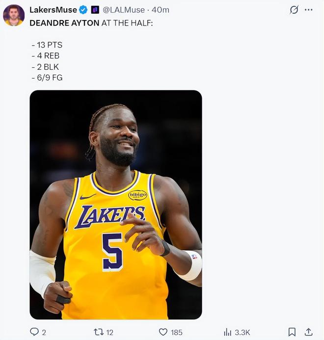 湖媒:艾顿这场比赛表现的像头野兽。(今夏艾顿与湖人签下两年1600万,今年只有800万的艾顿这个表现真的可以了)